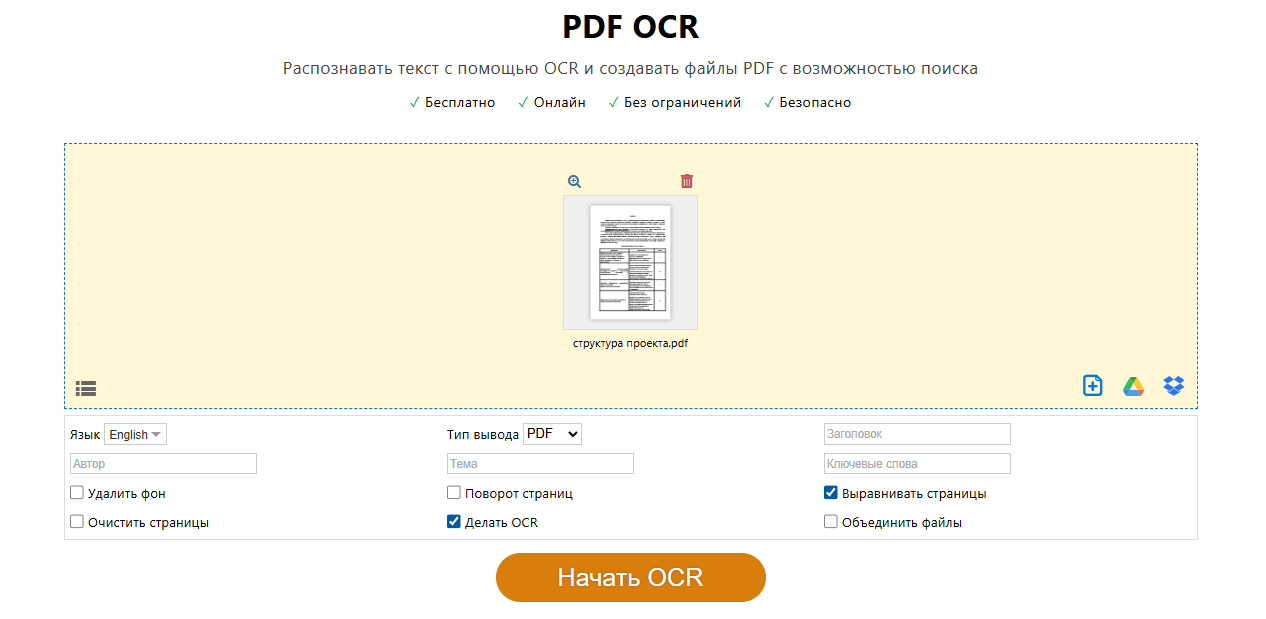 PDF24 Tools — онлайн-сервис с множеством инструментов, в том числе здесь есть оптическое распознавание текста с фото. Сайт бесплатный, не накладывает водяной знак, однако во время работы показывает рекламу. Эта программа для распознавания текста с PDF подойдет самозанятым.