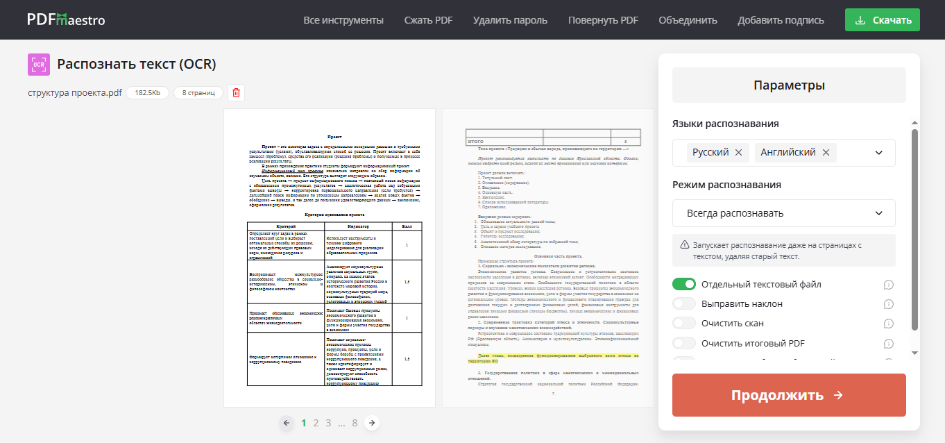 PDF Maestro — онлайн-инструмент для редактирования PDF-документов. Разработчики предоставляют десятки опций, среди которых есть и бесплатная программа для распознавания текста с фото. Чтобы воспользоваться функцией распознавания, достаточно загрузить контент на сайт и дождаться конца обработки. Сервис сам очищает пятна и шумы, исправляет наклоненные сканы и преобразовывает результат в редактируемый формат. Ограничений по количеству загрузок в день или размеру ПДФ нет. Также сайт не накладывает водяной знак.